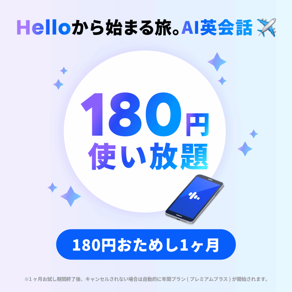 しかし、独自の視点として比較したいのが、導入時の心理的・経済的なハードルです。スピークは現在、1ヶ月180円という驚異的な価格でお試しができるキャンペーンを実施しており、まずは自分に合うか確認したいというユーザーにとって圧倒的に有利な条件が提示されています。
